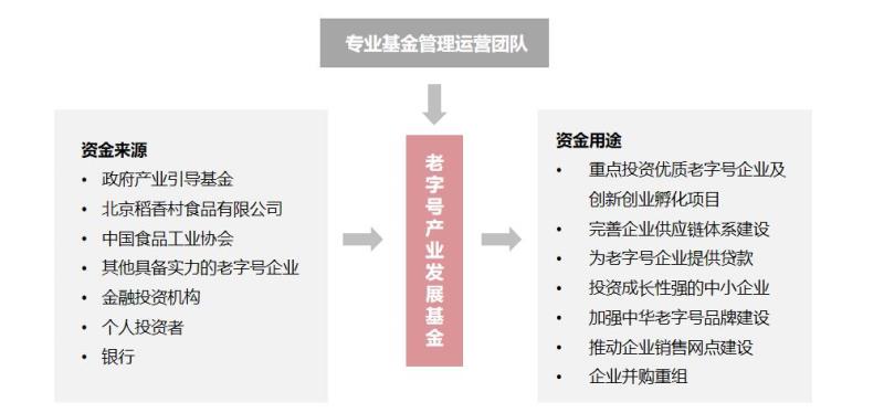 充分發揮金融資本的力量,進一步發揮老字號企業的優勢資源,提升中華老字號的品牌價值,助推老字號企業創新發展,促進老字號產業健康發展。以中國食品工業協會為主導,引入政府產業引導基金、金融投資機構、銀行、北京稻香村和其他老子號企業及個人投資者等建立老字號產業發展基金,由專業基金管理團隊負責運營,主要用于投資優質老字號企業及創新創業孵化項目、為老字號企業提供金融貸款,完善企業供應鏈體系建設、企業并購重組等。