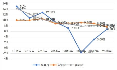 圖1:“十二五”以來深圳、岳陽、高要經濟發展比較
