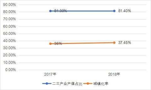其次,城鎮化滯后于工業化。2017年和2018年高要區非農產業產值占地區生產總值的比重分別為81.3¥和81.4%,表明處于工業化中期階段;而同期城鎮化率分別為36%和37.45%,處于城鎮化初級階段。城鎮化嚴重滯后于工業化。