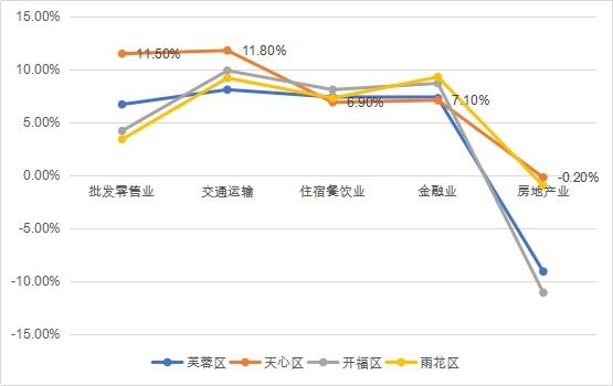 通過(guò)對(duì)比分析,發(fā)現(xiàn)2017年天心區(qū)批發(fā)零售業(yè)、交通運(yùn)輸業(yè)增長(zhǎng)率遠(yuǎn)高于芙蓉區(qū)等其他四個(gè)城區(qū);房地產(chǎn)業(yè)下降幅度遠(yuǎn)低于其他城區(qū),表明區(qū)域吸引力在逐漸增大。其他指標(biāo)則與其他城區(qū)接近。總體而言,天心區(qū)服務(wù)業(yè)吸引力在快速增加。