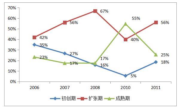 圖:2006-2014年我國風(fēng)險(xiǎn)投資分階段分布 [ 數(shù)據(jù)來源:清科研究中心《中國股權(quán)投資市場2014年全年回顧》]