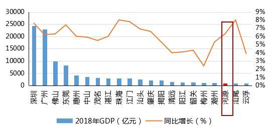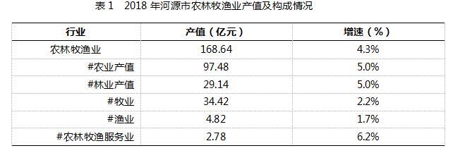2018年,河源市GDP首破千億元大關,但經濟總量及人均GDP位居廣東省下游水平,經濟增速有所放緩但仍穩居全省中上游水平,整體處于工業化和城市化向中期邁進階段。產業結構逐步合理,服務業比重首次突破50%,農民人均收入首超全國平均水平,高質量發展穩步推進,新舊動能轉換明顯加快。從產業結構看,第一產業占據河源市GDP的10%左右,傳統農牧業仍占據現代農業主導地位,農林牧漁服務業成為現代農業發展亮點,但總量規模仍需亟待提升。從農業發展載體看,2018年新增4個省級現代農業產業園、5個省級農業標準化示范區,燈塔盆地核心區建設穩步推進,龍川國家級電子商務進農村綜合示范縣順利通過國家驗收,船塘鎮(板栗)、龍窩鎮(茶葉)入選全國農業產業強鎮示范建設,農業農村產業發展載體進一步夯實。農村重點領域改革深入推進,農村集體產權制度改革穩步推進,農村土地確權登記頒證基本完成,農村產權流轉管理服務平臺和鎮(街)級平臺逐步完善,信用村和鄉村金融服務站實現行政村全覆蓋。