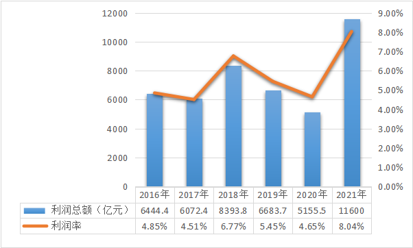 圖3-5 2016-2021年規(guī)上企業(yè)利潤總額(億元)和利潤率
