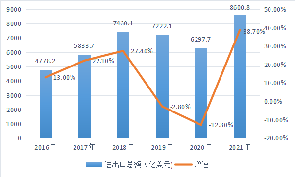 ——外貿(mào)進(jìn)出口保持強(qiáng)勁增長。2021年石油和化工行業(yè)進(jìn)出口總額創(chuàng)歷史新高,達(dá)到8600.8億美元,較2016年同比增長80.0%,占全進(jìn)出口總額的14.2%;其中,出口額2955.5億美元,進(jìn)口額5645.4億美元,貿(mào)易逆差增2689.9億美元,較2016年翻倍。