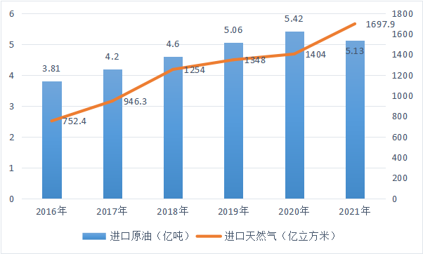 圖3-8 2016-2021年進(jìn)口原油和天然氣數(shù)量