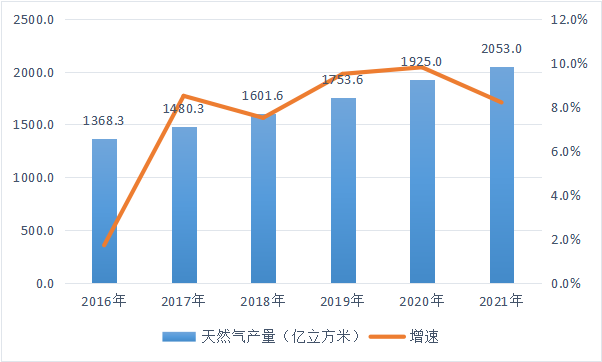 圖3-11 2016-2021年天然氣產(chǎn)量(億立方米)及增速