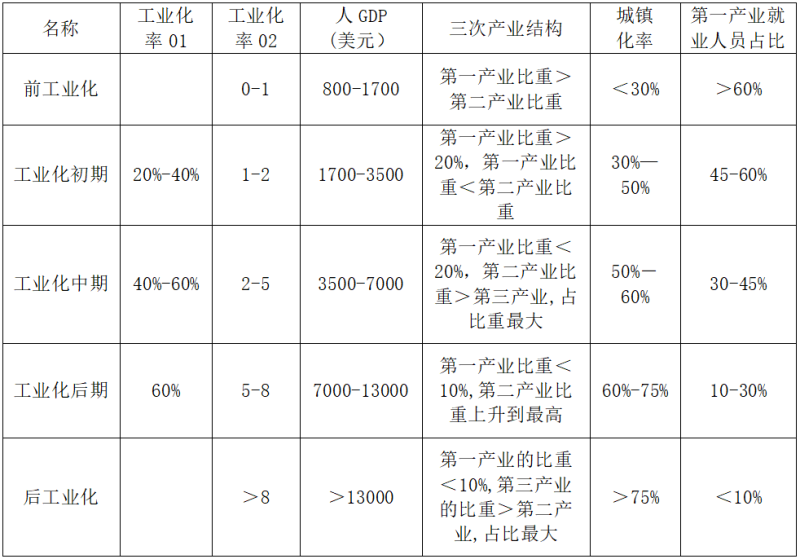 工業(yè)化進(jìn)程一般分為前工業(yè)化、工業(yè)化初期、工業(yè)化中期、工業(yè)化后期和后工業(yè)化五大階段,根據(jù)國際通行的研究成果,主要判斷指標(biāo)有工業(yè)化率、人均GDP、三次產(chǎn)業(yè)結(jié)構(gòu)、城鎮(zhèn)化率、就業(yè)人口結(jié)構(gòu)等標(biāo)準(zhǔn)。