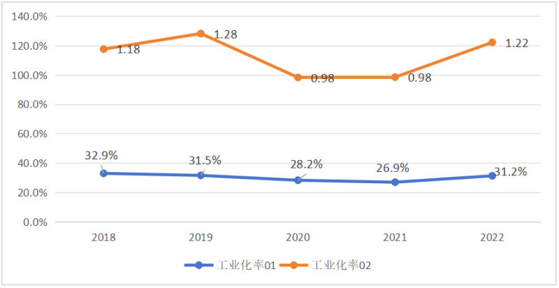 從工業(yè)化率來看,有兩種計(jì)算方法:工業(yè)化率(01)=工業(yè)增加值占地區(qū)生產(chǎn)總值比重,工業(yè)化率(02)=工業(yè)增加值與農(nóng)業(yè)增加值的比值。2020年以來江陵縣工業(yè)增加值保持兩位數(shù)快速增長,2022年工業(yè)增加值占地區(qū)生產(chǎn)總值比重為31.2%,工業(yè)增加值與農(nóng)業(yè)增加值的比值為1.22,處于工業(yè)化初期階段。