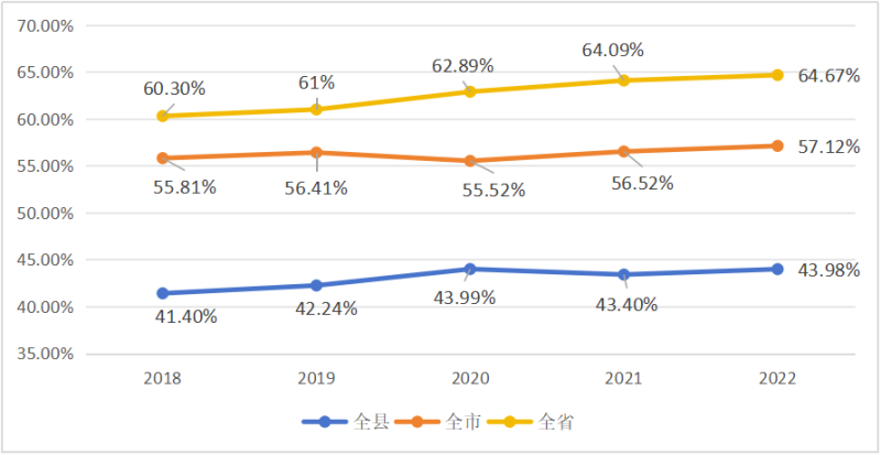 從城鎮(zhèn)化率來看,2018-2020年,江陵縣城鎮(zhèn)化率保持較快增長,2020年以后城鎮(zhèn)化率發(fā)展趨于緩慢,維持在44%水平,處于工業(yè)化初期階段。江陵縣城鎮(zhèn)化率遠(yuǎn)遠(yuǎn)低于全市、全省水平,城鎮(zhèn)化進(jìn)程較為滯后,仍有較大提升空間。