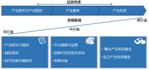 依托核心產業促進能力,以產業研究與產業規劃為切入點,最終通過提出操作性方案及深度介入,與客戶形成以下良性互動