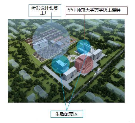 本項目分為三大功能區:華中師范大學藥學院主樓群、研發設計創意工廠、生活配套區。
