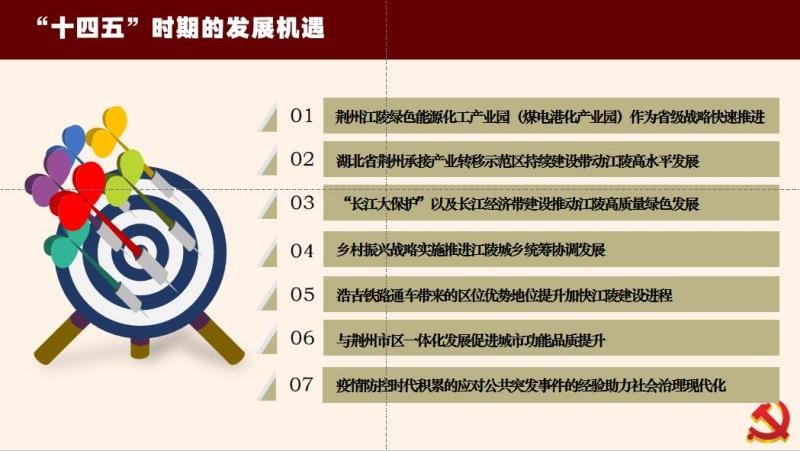 緊抓長(zhǎng)江經(jīng)濟(jì)帶建設(shè)、國(guó)家北煤南運(yùn)大通道浩吉鐵路投入運(yùn)營(yíng)以及荊州江陵綠色能源化工產(chǎn)業(yè)園升級(jí)為省級(jí)戰(zhàn)略等一系列重大發(fā)展機(jī)遇,以“經(jīng)濟(jì)總量翻一番、加速發(fā)展?fàn)幰涣鳌睘榭傮w目標(biāo),聚焦“一中心兩基地”建設(shè),推動(dòng)“2+N”產(chǎn)業(yè)體系加速形成,全力打造千億級(jí)產(chǎn)業(yè)核心,濃墨繪就“三張藍(lán)圖”,重彩描出“三種顏色”,發(fā)揮宜荊荊城市群、沿江經(jīng)濟(jì)帶“龍腰”作用,推動(dòng)城鄉(xiāng)融合和融城發(fā)展,持續(xù)推進(jìn)“五個(gè)新江陵”建設(shè),奠定全面建設(shè)社會(huì)主義現(xiàn)代化強(qiáng)縣的新開(kāi)局。